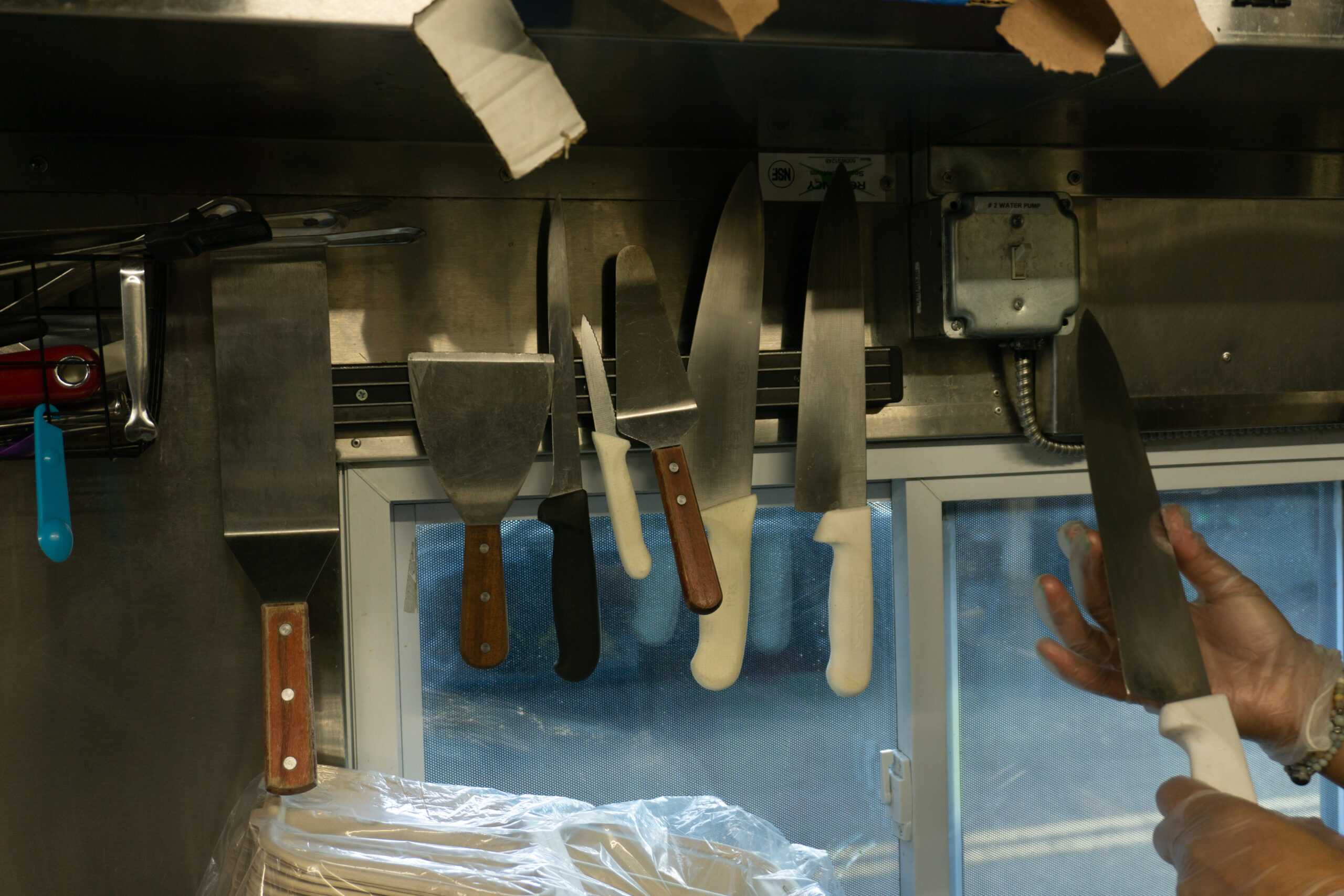 - Nov. 18, 2022–New York, NY: Scenes from Livonia Avenue, Brooklyn. Akeelah is selecting a knife to cut vegetables. Photo by Leying Tang.