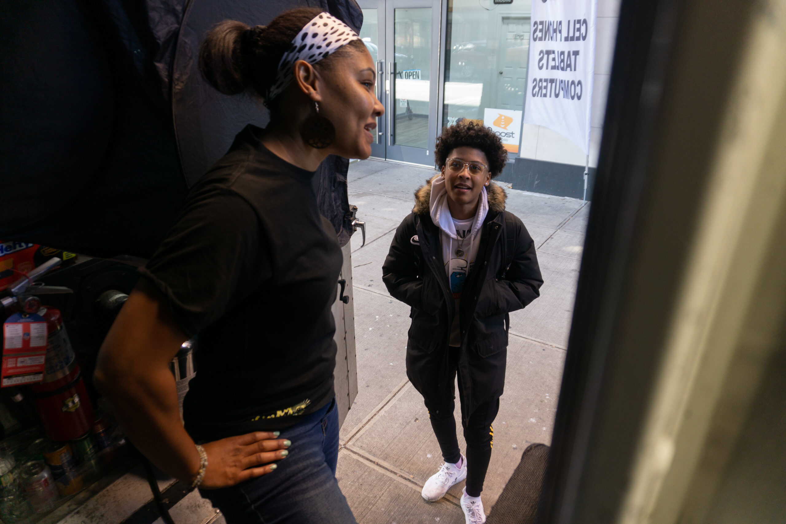 - Nov. 18, 2022–New York, NY: Scenes from Livonia Avenue, Brooklyn. Akeelah is chatting with her son in her food truck. He is 16 years old and will go to college next year. Photo by Leying Tang.