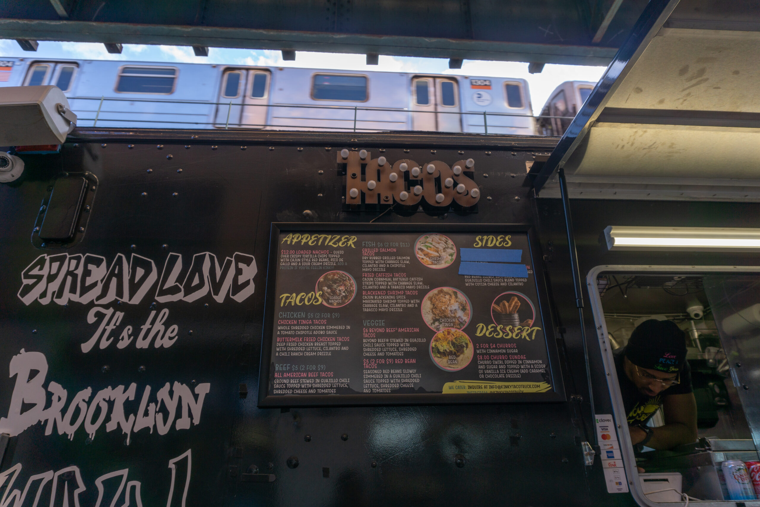 - Nov. 18, 2022–New York, NY: Scenes from Livonia Avenue, Brooklyn. Mikell is inputing orders on the machine, while the subway is passing above. On the left is the Kinky Taco menu. Photo by Leying Tang.