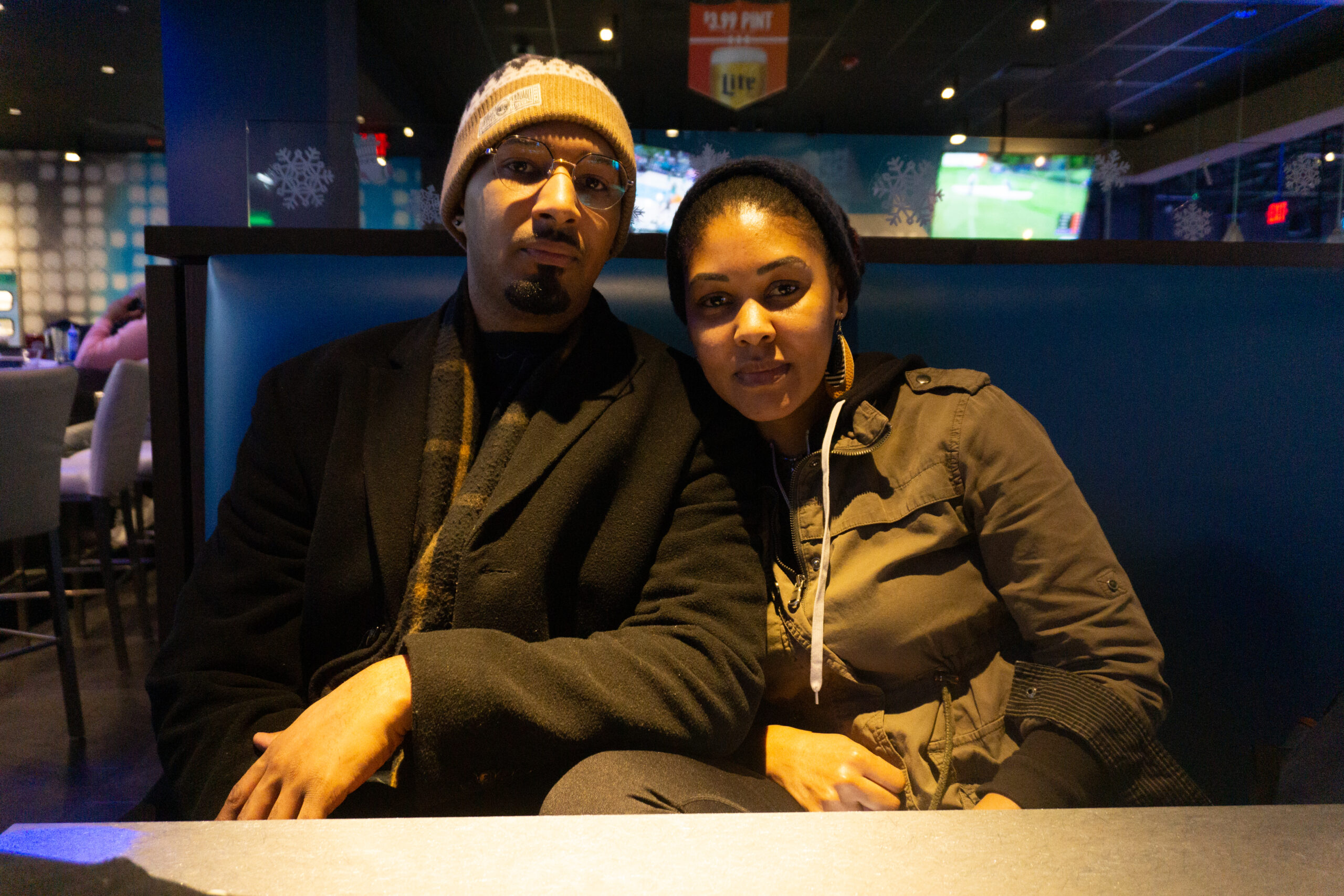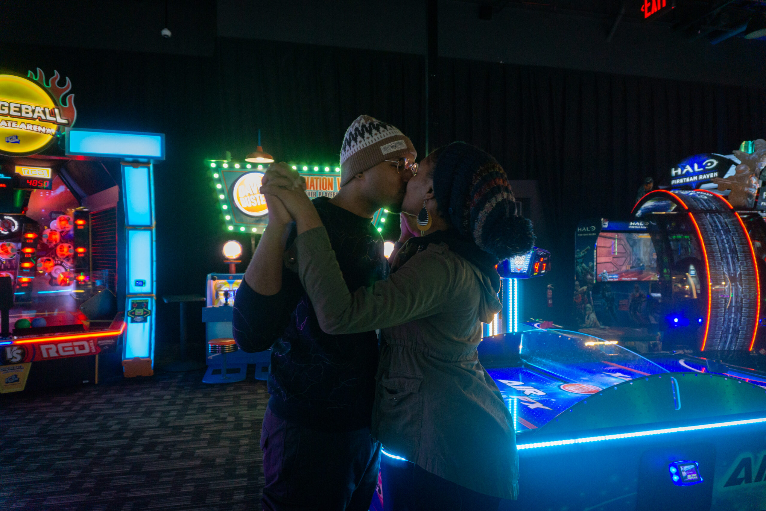 - Dec. 8, 2022–New York, NY: Scenes from Dave & Buster’s in Brooklyn. The couple embraces after finishing a fierce game of table hockey. Photo by Leying Tang.
