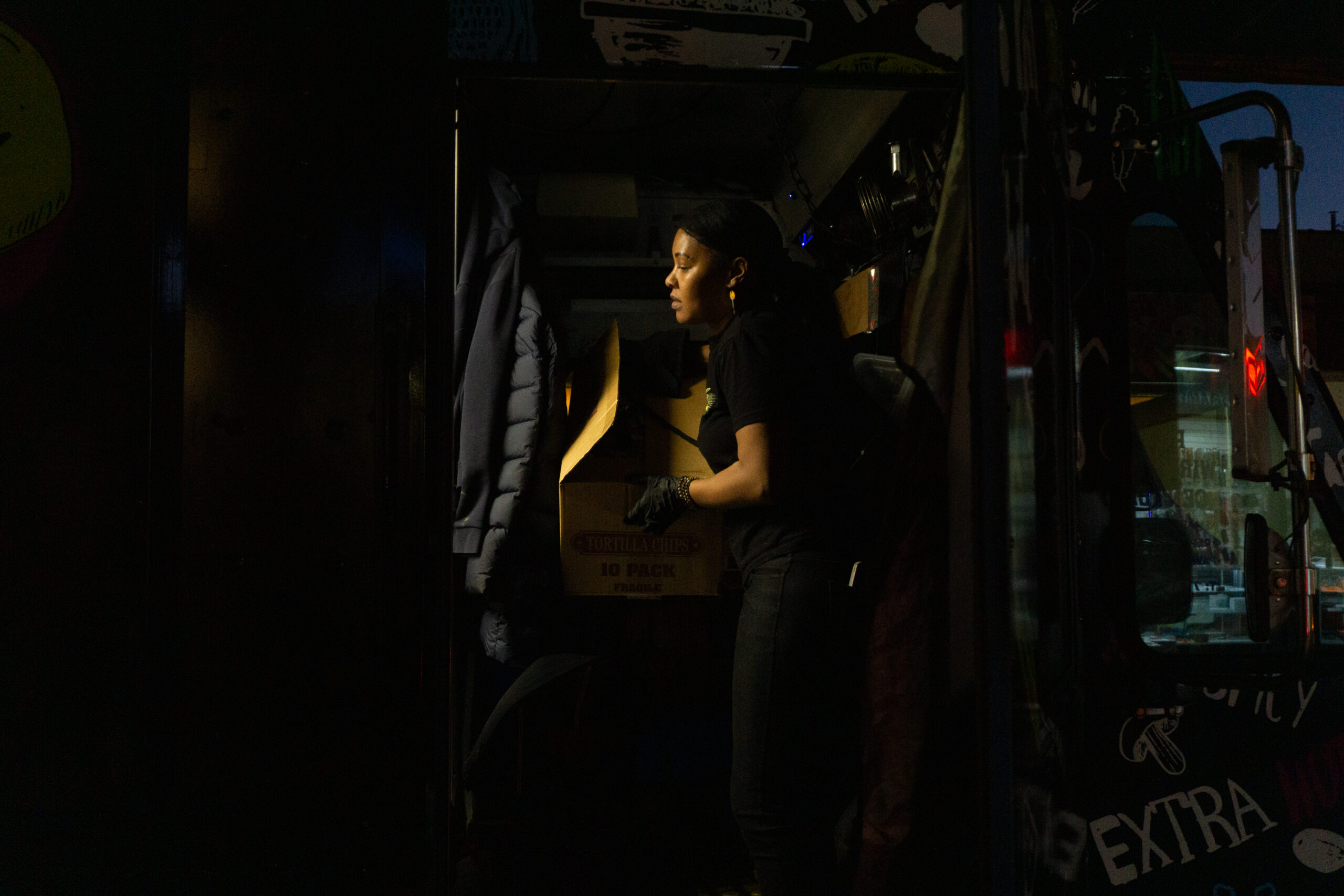 - Nov. 17, 2022–New York, NY: Scenes from a food truck parking lot in Brooklyn. Akeelah is tidying up in the truck after she finishes her work. Photo by Leying Tang.