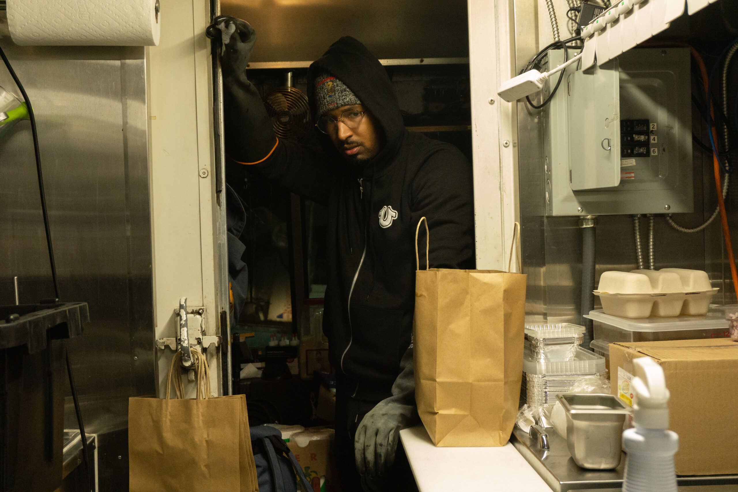 - Nov. 17, 2022–New York, NY: Scenes from a food truck parking lot in Brooklyn. Mikell returns to the food truck after he finishes washing utensils. Photo by Leying Tang.