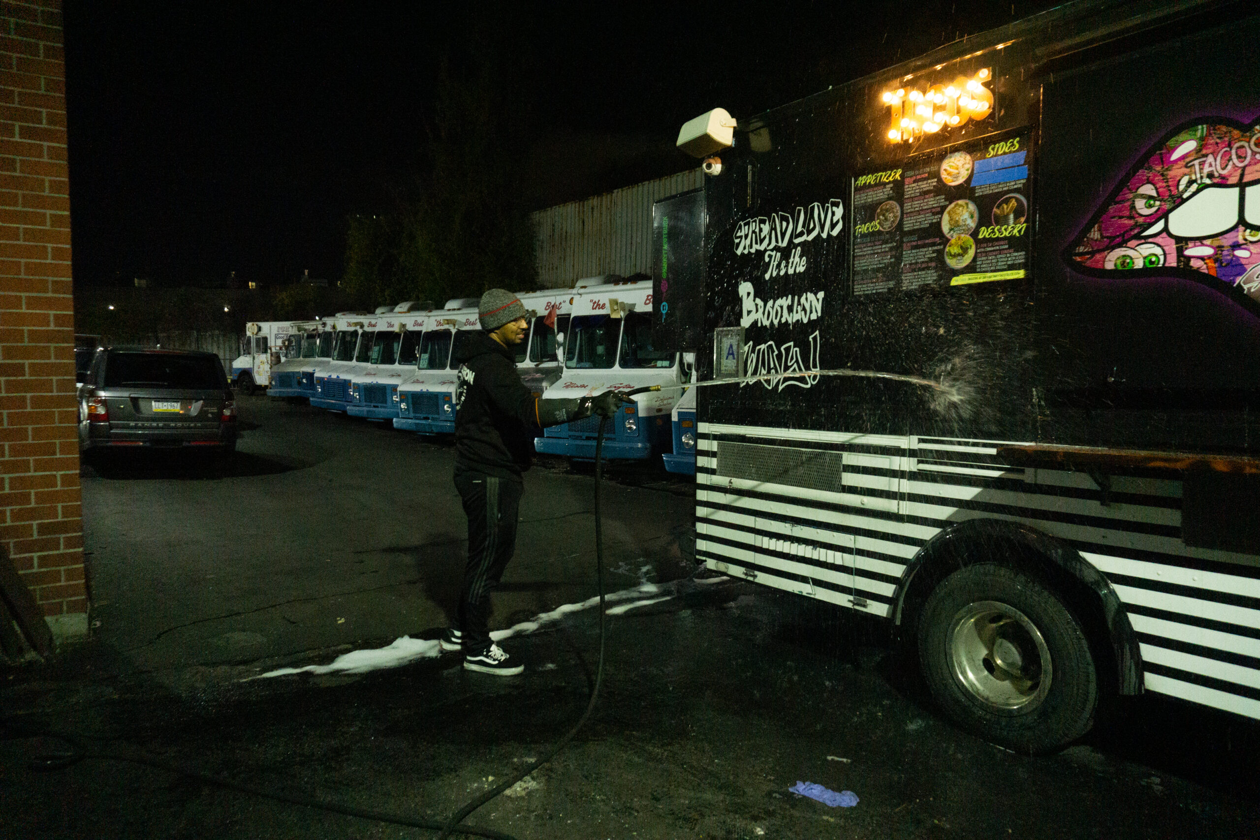- Nov. 17, 2022–New York, NY: Scenes from a food truck parking lot in Brooklyn. Mikell cleans the exterior of food truck. He says some food trucks won’t open in winter because it can get too cold to clean the vehicles. Photo by Leying Tang.