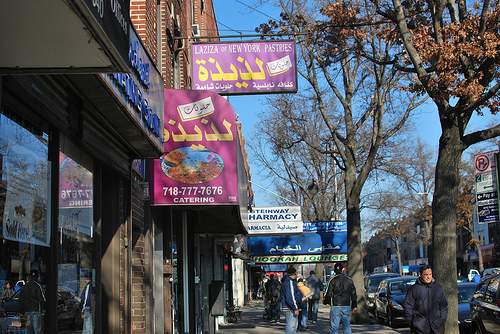 Arabic on business awnings and windows are a regular sight on the two-block stretch of Steinway Street, home to many halal meat shops, hookah bars, doctor's offices, traditional Arab clothing shops and more. Photo by Joann Pan
