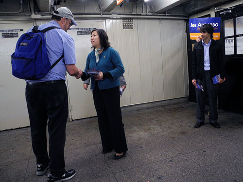 Congressional candidate Grace Meng spends her mornings greeting potential voters at subway stations around Queens.