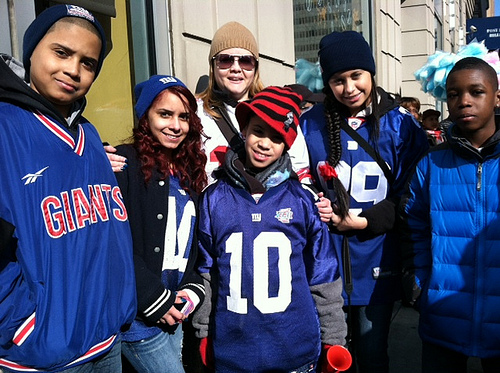 A parted sea of blue jerseys and hats lined New York City’s Canyon of Heroes for this morning’s ticker-tape parade. The celebration was in honor of the Giants win over the New England Patriots in Sunday’s Super Bowl. Floats carrying the victorious football team cruised up the wide, sunny avenue to chants of “Let’s go Giants,” and bone-rattling vuvuzela honks.