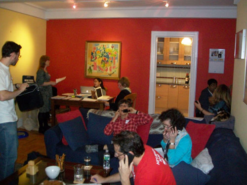Ann Hinshaw splits the hosting duties with Wolfsthal, serving as the only actual campaign staff member present. As the Obama campaign phone bank coordinator for downtown east, she spends many nights at phone banks in a variety of settings. When the 30-year-old public relations executive arrived at Wolfsthal’s Second Avenue apartment, she greeted the regulars, poured a glass of red wine, and started handing out materials; a script, a list of Ohio voters, a call log to mark results.