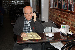 Vinny Vella, a 3rd generation Italian-American, sat at the little patio outside La Bella Café, at a marble topped table scattered about with lottery scratch tickets, laughing and joking with friends while watching passersby on Mulberry Street.