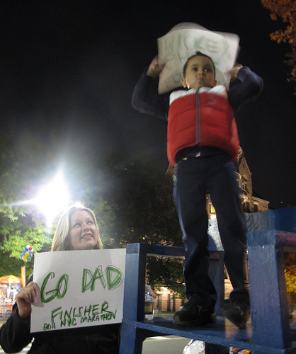 Standing outside a security barricade at 72nd Street and Central Park West at around 8 PM Sunday, people initially held up signs like “Go Dad” and “Good Job Grandpa Mickey!” but many soon turned hungry and cold from all the waiting and shifted into survival mode, wolfing down hot dogs or bouncing in place. Others, like 27-year-old Vanessa Crooks of Panama, stared at an I-Pad, attempting to locate their friends’ or relatives’ whereabouts via a marathon website (a tracking chip, planted within the runners’ numbered bibs, was supposed to isolate runners’ geographical position). Crooks said she had “no idea” what had happened to her friend, who’d been having knee problems in the days leading up to the race.