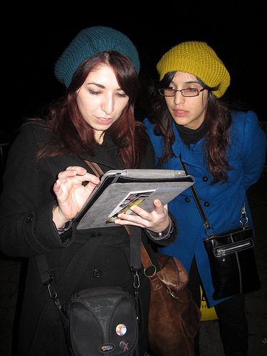 Vanessa Crooks (left), 27, and Carolina Sato, 23, try to locate their friend via iPad using a marathon app that helps track runners. Crooks and Sato, whose friend still hadn't appeared at the finish line by 8 PM Sunday night, are both from Panama. Photo by Louie Lazar.