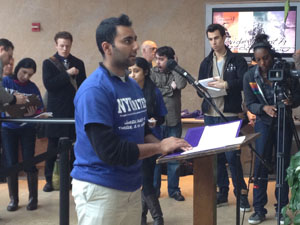 Ahmad Raza, 22, ISA undergraduate chapter president, speaks to the crowd. Photo by Dominique Z. Scott