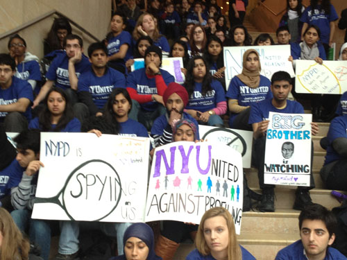Dressed in blue T-shirts with bold, white writing that read “NYUnited,” and armed with homemade signs that boasted, “Big Brother is Watching” and “NYU is Against Profiling,” more than 100 students sat for a peaceful student address on the grand stairs at New York University’s Kimmel Hall this afternoon.