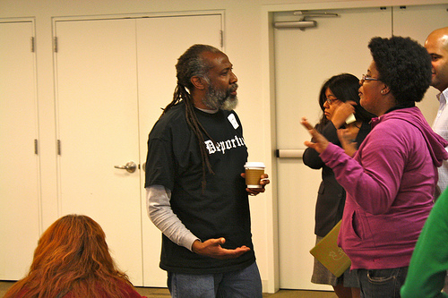 Donald Anthonyson, talks about immigrant workers justice with another group member. Photo by Eric Zerkel
