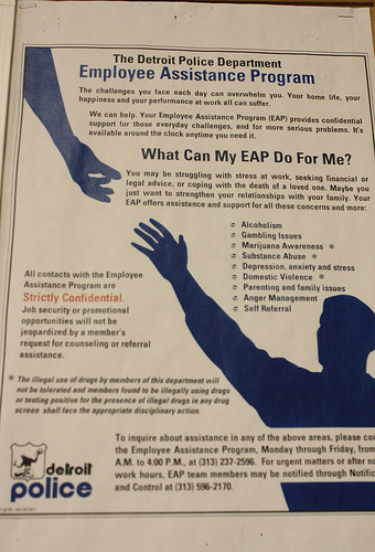 While officers are aware that confiding in partners is not the best method, they still do not seek the help of professionals. Posters advertising the aid of the Employee Assistance Program hang around the various Detroit precincts, but very few call the confidential outlet.