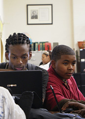 Donald Bailey III, 13, (right) said he and his friends use the Chase Branch of the Detroit Public Library everyday after school and on Saturdays. He doesn't have internet access at home and says he is able to concentrate on his homework better at the library than at home or school. Photo by Jessica Bell