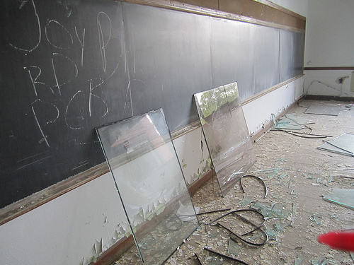 Pushing open a heavy side door, permanently propped open to allow easy access for intruders, urban explorer John gingerly stepped through tiny shards of glass that littered the now darkened hallways. The darkness, pierced with shafts of sunlight, broke through the gapping holes that once held windows. Bits of paper, wood splinters and broken lockers ripped from the walls completed the picture of what is now David Mackenzie High School.