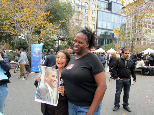 For Polk, there is even more at stake this time. Small and visibly frail, Polk, at rest, looks her age. When animated, she looks years younger. She is good at keeping the years at bay. A former concert pianist, Polk still gives public performances and in addition to manning the Obama table at Union Square, she volunteers at a local Obama phone bank every Wednesday. She was scheduled to get on a bus to Ohio to canvass before a bout with the flu forced her to cancel. However, she said proudly, “My daughter and my two grandchildren will be in Ohio right up until the election.”