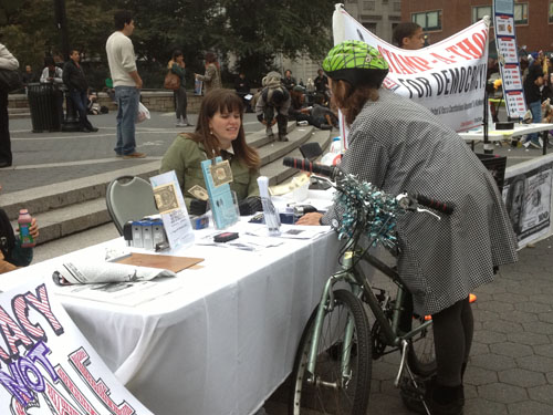 The energetic activist is a friend of Ben & Jerry’s co-founder Ben Cohen and was one of the many volunteers at the Stamp Stampede Stampathon for Democracy, a public awareness event at Union Square Park held on Wednesday, October 24th. The group was rallying around the current presidential and mayoral elections in a way that did not involve raising funds, choosing teams, parading red or blue and donkey or elephant gear, or gratuitously praising the attributes of one candidate or another. The Stamp Stampede and its mini-marathon (12 hours of stamping cash) were conceived by Cohen with a campaign finance reform initiative in mind.